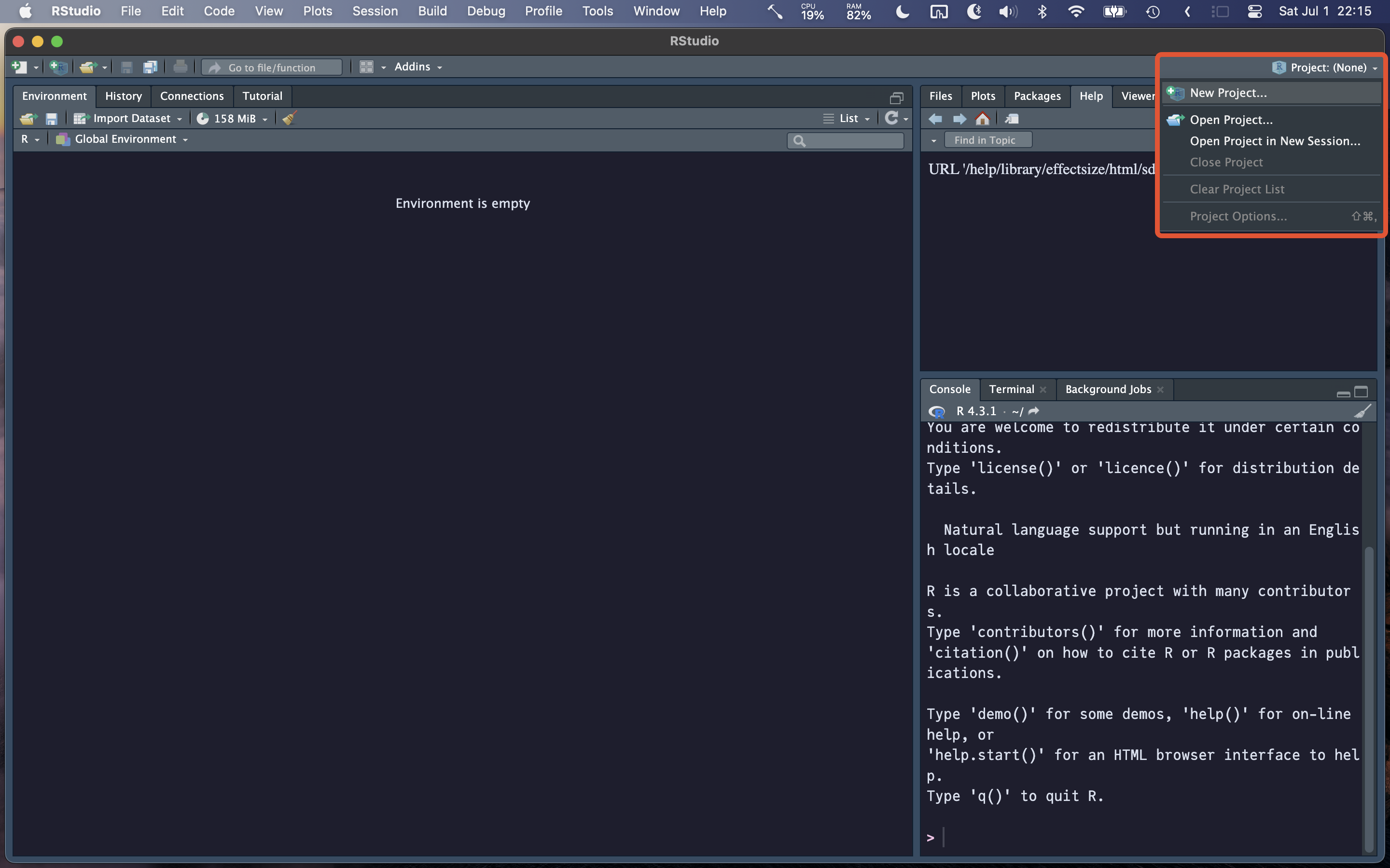 To create a new RStudio projet, simply open up RStudio, and click on the “Project: (None)” button in the top right corner.
