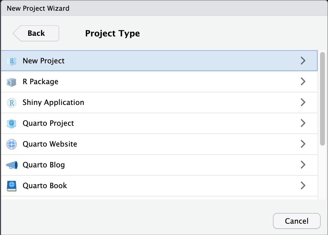 You will then be given the option to create the project in a “New Directory”, and “Existing Directory”, or from “Version Control”. If you’ve already created a project just for this workshop, then select “Existing Directory”, otherwise, create a new one. If you know about Git, then please feel free to use the last option, but options 1 & 2 are most relevant for new users. Either way, we’d recommend reading through our project organization tips about what this directory should look like/include. If you select “New Directory”, you probably want to select “New Project” on the next option, unless you have something specific in mind (like a “Quarto Book”, which is used for this website!).